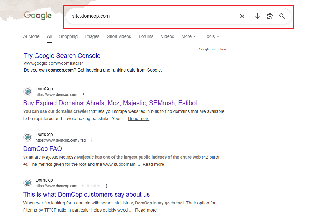 Replace “example.com” with the domain you want to check. For example, for DomCop, I would type “site:domcop.com” and then hit Enter.