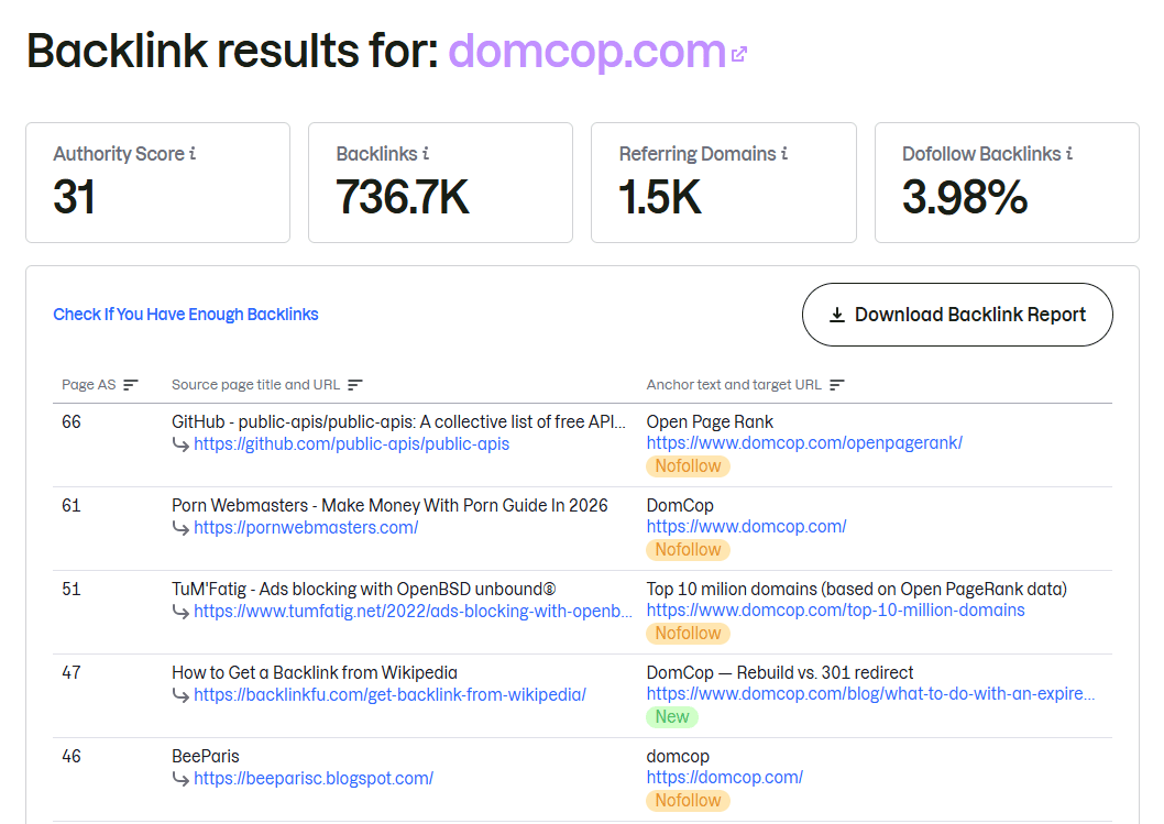 I’ve used SEMrush to show an example of domain backlink analysis. Take a look at DomCop’s backlink profile: