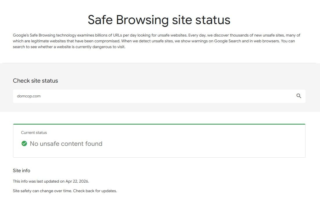 Go to transparencyreport.google.com/safe-browsing/search and type in the domain name. That’s it. Here’s a screenshot of DomCop’s safe browsing site status: